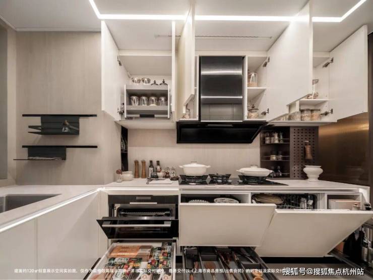 厨房特别设计 :转角柜用旋转拉篮,深处东西一拉就出来;吊柜有下拉式拉篮,不用踩凳子;抽屉里还有细分格子,餐具不会乱。