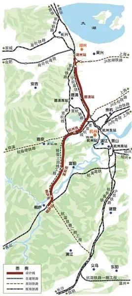 湖杭铁路全称湖州至杭州西至杭黄铁路连接线,全线长约137公里,为双线高速铁路,设计速度350公里/小时,全线共设湖州站、德清站、杭州西站、富阳西站、桐庐东站、桐庐站等六座车站,铁路自湖州站引出,经桐庐站接入杭黄高铁。