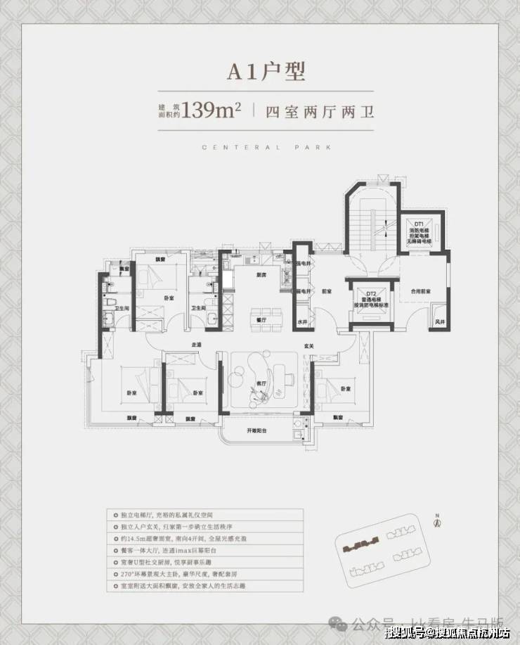 户型设计精巧:主打110-139㎡的3-4房户型,适配改善需求。其中,110㎡三房边套户型有约5.4m超大横厅,南向面宽约12.3米,还有巨幕阳台与270°景观视野;139㎡四房西边套为独立电梯厅、大横厅设计,南向奢阔面宽约15.05米,主卧全套房搭配270°转角飘窗和独立卫浴,居住体验佳。目前仅接待预约客户,