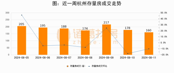 从存量房来看,2024年08月11日杭州存量房单日成交160套,比昨日减少18套,环比下降10.1%。从近一周存量房成交来看,杭州存量房日均成交套数为188套,08月11日单日成交160套,低于近一周平均水平14.9%。