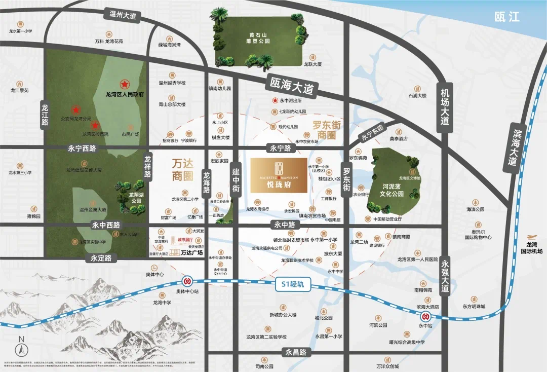 交通出行方面,由瓯海大道、机场大道、S1轻轨线(奥体站、永中站)、M1地铁(规划中)、温州东站(2022年开建)、龙湾机场,构成多维交通路网,出捷入畅,际会世界。