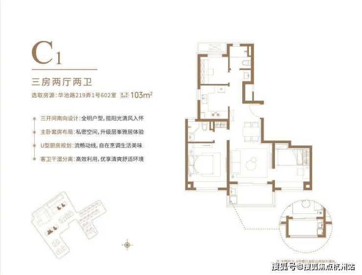 U型厨房的设计、干湿分离的卫浴、套房式的主卧等等。