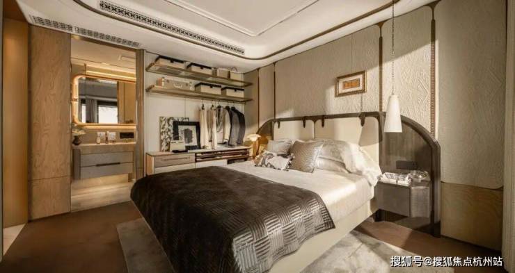 主卧标配约4.6米超大面宽贝母马赛克弧形皮革背景墙,地面采用和保利世博天悦同款的嵌铜荷叶拼地板,且嵌铜花色可以选择。
