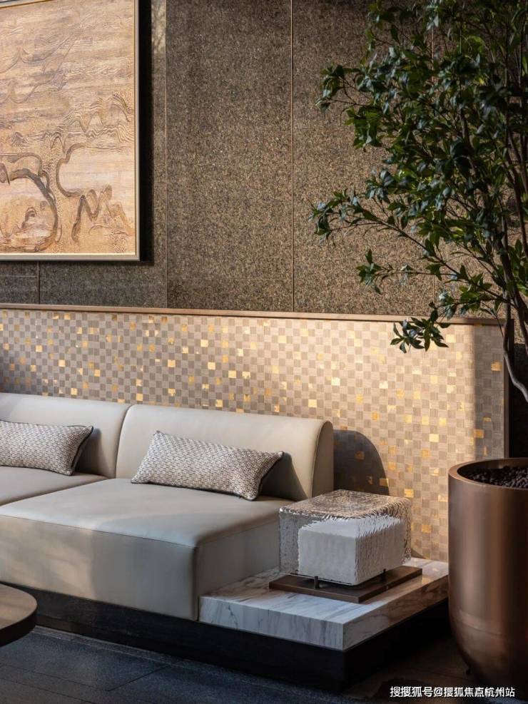 黄金丝绸大理石流转着真丝般的光泽,白玉与卡里冰玉小台映照天光云影。