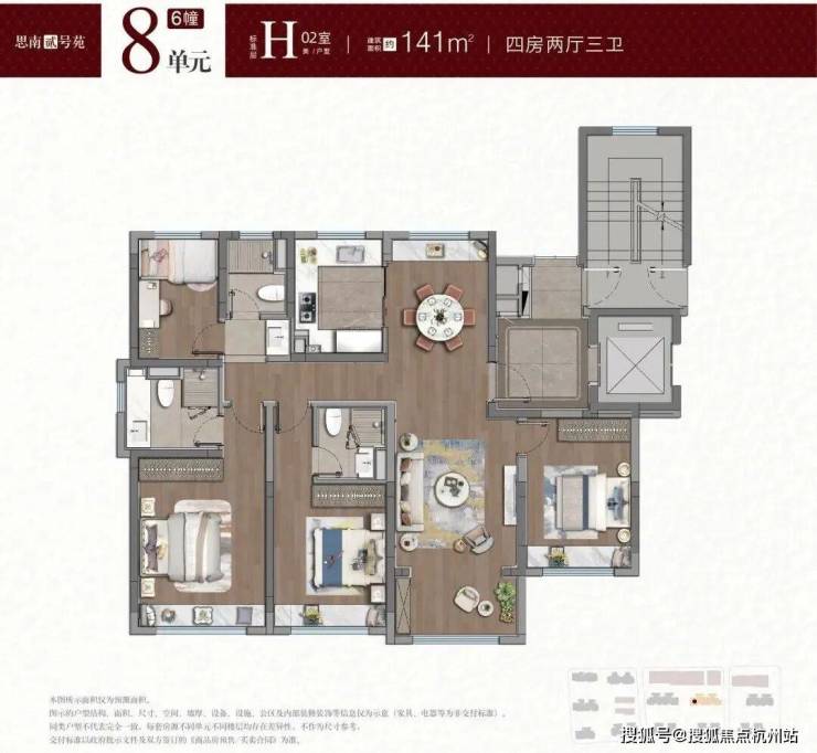 建面约144㎡H户型,四开间朝南,其中有两个套间,满足2孩家庭或事三代同堂的家庭结构。