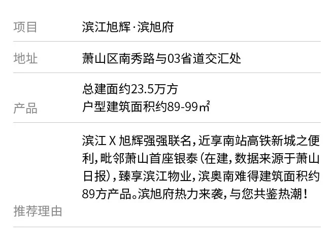 本项目核准地名为“滨旭府“。本广告为要约邀请,买卖双方的权利义务以双方签署的《商品房买卖合同》及附件等书面协议为准。本公司在交易过程中提供的各类配套信息均来自政府相关主管部门或机构公开信息或商业合约或现场现状,相关信息更新截止于本公示所载印制时间,后续各类相关信息可能发生变化。各类配套设施相关较新信息及情况,须以政府相关主管部门、机构公开较新信息为准。本文中对项目周边环境、交通、教育及其它配套设施的介绍,旨在提供相关信息,不意味着本公司对此作出了承诺和保证。信息采集时间为2021年6月。本文发布时间为2021年6月11日,有效期1个月。本项目开发商为:杭州兴塘置业有限公司。本公司保留对本宣传修改的权利,敬请留意较新资料。预售证号:萧售许字2020第01076号,萧售许字2020第ZJ00133号,萧售许字(2021)第ZJ00406号,萧售许字(2021)第ZJ01927号。总价约220万元起,房源18#102房。特别提示:本公司在交易过程中提供的各类配套信息均来自政府相关主管部门或机构公开信息或商业合约或现场现状,相关信息更新截止于本公示所载印制时间,后续各类相关信息可能发生变化。各类配套设施相关较新信息及情况,须以政府相关主管部门、机构公开较新信息为准。本页中对项目周边环境、交通、教育及其它配套设施的介绍,旨在提供相关信息,不意味着本公司对此作出了承诺和保证。截止2021年6月,直线距离约3.5km范围内,目前在售新房源中,只有滨旭府由滨江集团打造。本广告中图片仅供欣赏展示,非交付标准。文中所提绿植的种类、面积大小、分布位置等具体以实际交付为准,部分植物仅种植在特定区域。