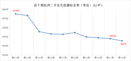 从近十周来看,杭州二手住宅挂牌价从35746元/㎡下滑至上周的34274元/㎡,趋势也十分明显。