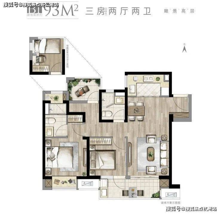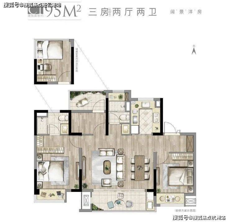本案95㎡户型,改造后是一个舒适型的三房二厅二卫的户型,约5.5米朝南横厅设计,采光面非常宽,一梯两户的设计超高得房率。