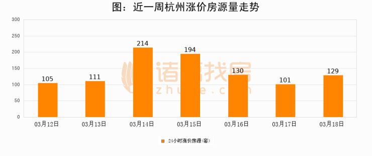 根据诸葛找房数据显示,杭州24小时涨价房源量为129套,较03月17日增加28套,环比上涨27.7%。与此同时,涨价房源占比小幅扩大,业主信心有所提升。