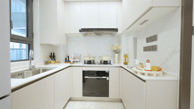 厨房则配备西门子厨房三件套——洗碗机(8套)、燃气灶、抽油烟机,将先进科技融入厨房生活;还有弗兰卡大尺寸水槽,使用方便;