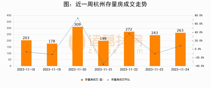从存量房来看,2023年11月24日杭州存量房单日成交263套,比昨日增加20套,环比上涨8.2%。从近一周存量房成交来看,杭州存量房日均成交套数为238套,11月24日单日成交263套,高于近一周平均水平10.5%。