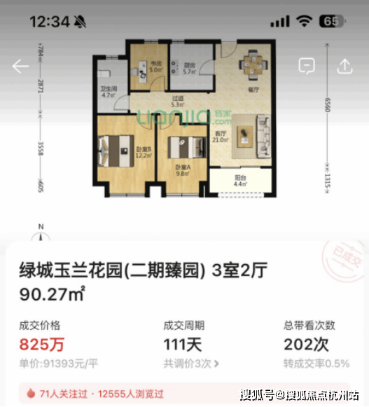 6.二手市场价格可期,旁边绿城二期今年成交一套 90m²小户型,单价9.1万,比保利天奕前期小户型最贵单价还贵出近1万/m²!