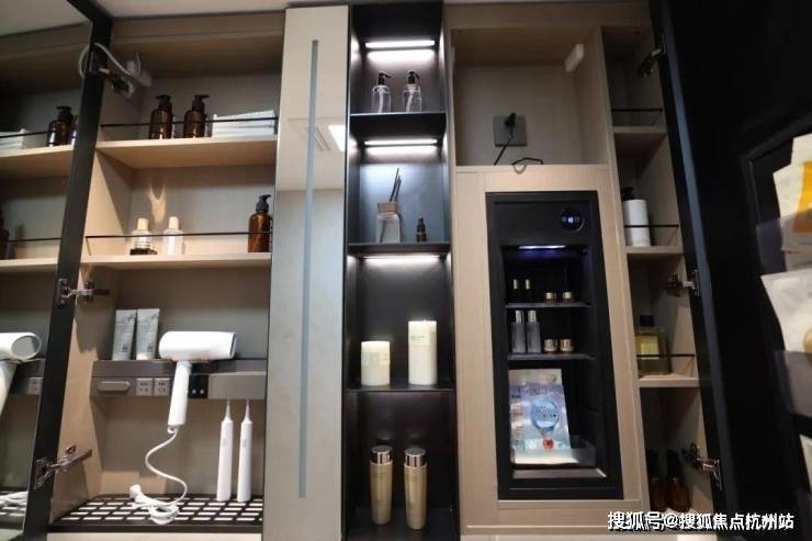 整面墙的镜柜,内部配备了美妆冰箱+门板收纳架+轨道式置物架,储物空间打造的非常充足。