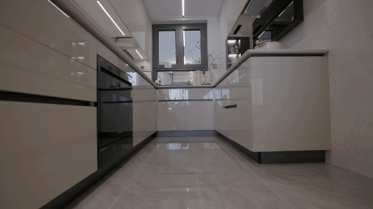 ● 厨房:接着往里走,来到厨房,铝合金边框茶色玻璃移门,采用上轨道设计,没有下轨道长时间变形的困扰,加上采用750*1500大砖的地面,显得整体美观且容易清理。