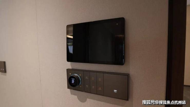 换好鞋,起身可以看到入户门旁配置了窄边框可视对讲,灰色高标肤感开关面板,三合一温控面板,未来可以通过它远程调节灯光,新风,中央空调,地暖,实现智能生活,到家就能享受舒适的居住状态。