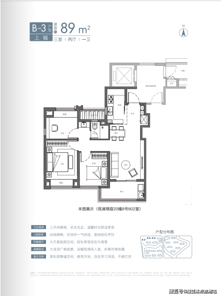 U型厨房、餐厅、客厅、阳台一线联通,南北通透。主卧套房、全卧飘窗、次卫干湿分离也都是标配。