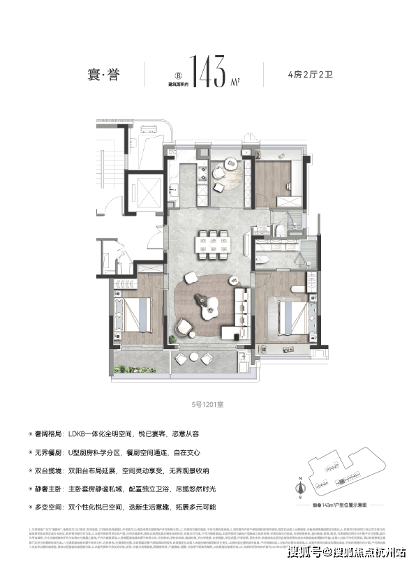 预算充足的改善家庭,还可选择约143㎡4房户型。作为内环内稀缺的控总价4房,它在尺度与舒适度上颇为出彩: