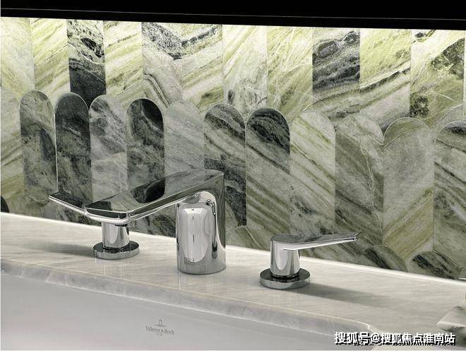基础硬件都不差,项目在审美上还做了不少创新——卫生间大量采用奢石和石材,比如主卫柜体墙面就是香格里拉翡翠拼花,龙头是冷热分离式,成本更高:
