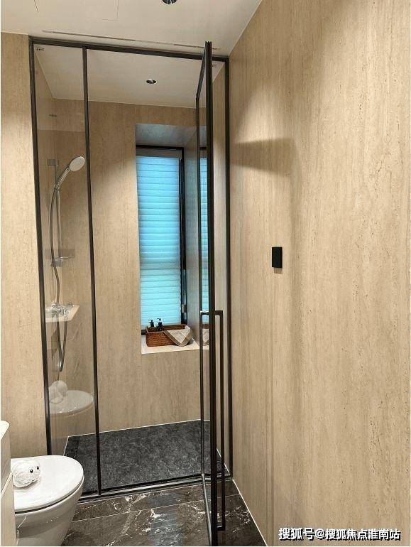 上海杨浦中建壹品外滩源著售楼处电话☎:400-9659-259(预约看房热线)次卫则是采用不同风格,墙面统一采用米洞岩板、地面为深咖色瓷砖,黑金配色风格区别于看多了的海派设计,眼前一亮: