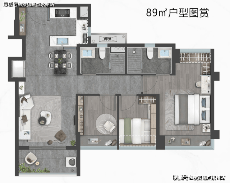 89㎡的3房2厅2卫: 设计的是新版竖厅格局,客厅开间3.5米,LDKB一体化,S墙设计预留冰箱位,约11米四面宽超幕视野,主卧套房带衣帽间,U型全开敞厨房,得房率:78.99%(不含赠送),有西北、西南、东北、东南4个朝向。