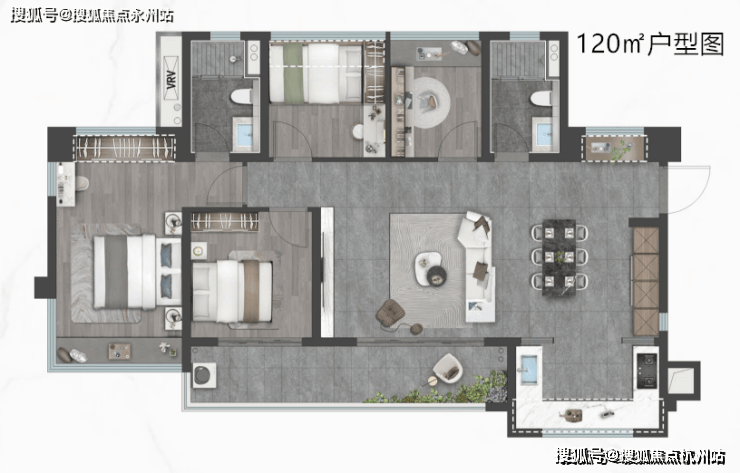 120㎡的4房2厅2卫: 设计的是横厅南北通透格局,客餐厅开间8米,约14.7米超幕视野,超长阳台,主卧转角270°大飘窗,U型厨房,得房率:78.99%(不含赠送),阳台主朝西南或东南向。