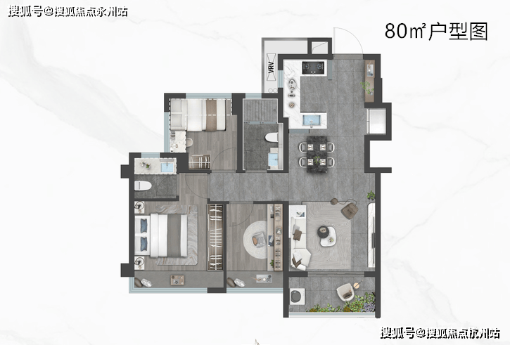 80㎡的3房2厅1.9卫: 设计的是竖厅格局,客厅开间3.4米,LDKB一体化,S墙设计预留冰箱位,U型半开放式厨房,创新式1.9卫设计,得房率:78.99%(不含赠送),有西北、西南、东北、东南4个朝向。