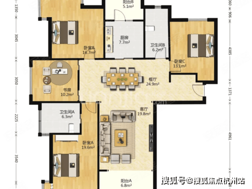 164㎡四房两厅两卫:阔绰四房、双阳台、餐客一体,满足多孩 / 三代同堂,总价约 1900 万起。