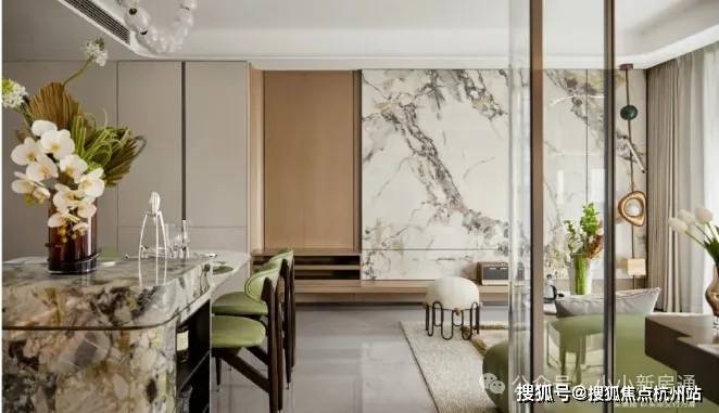 客厅岩板背景墙的应用,典雅气派、肌理丰富,营而着简约不失奢华的家居氛围。