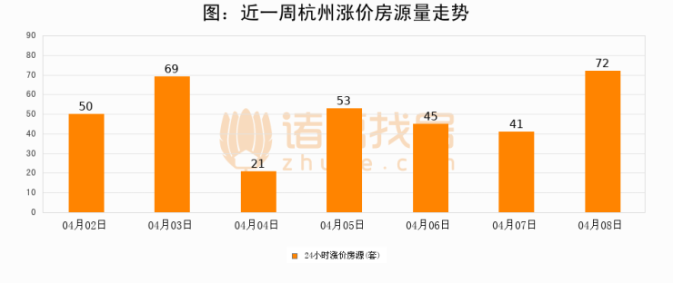 根据诸葛找房数据显示,杭州24小时涨价房源量为72套,较04月07日增加31套,环比上涨75.6%。与此同时,涨价房源占比小幅扩大,业主信心有所提升。