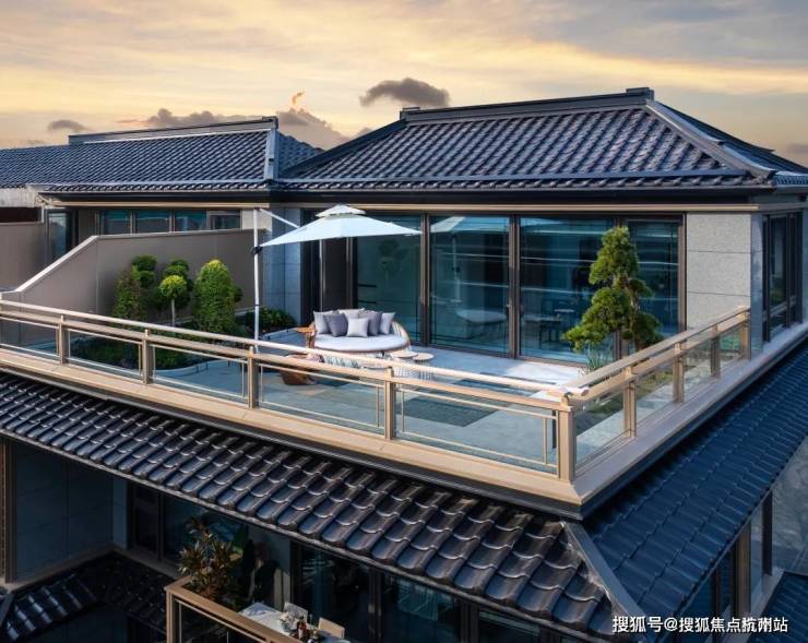 三重屋檐,代表天地人融合的东方宫殿最高等级,上檐、外檐、下檐三重结构,现代立面,以铝板、格栅、石材、瓦墙型材、玻璃等现代型材,彰显传世之宅的独特气度。