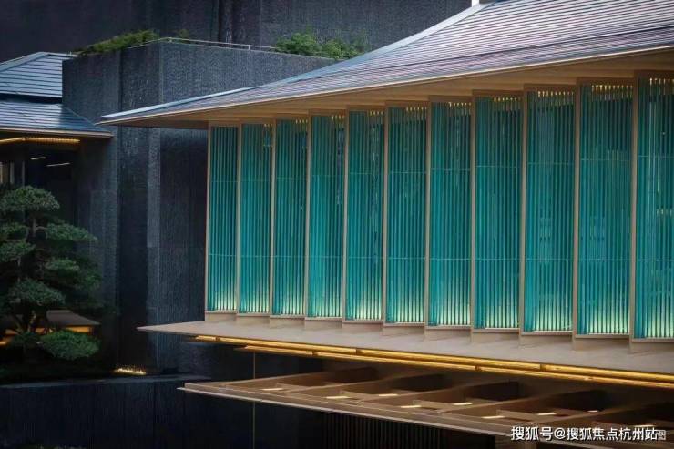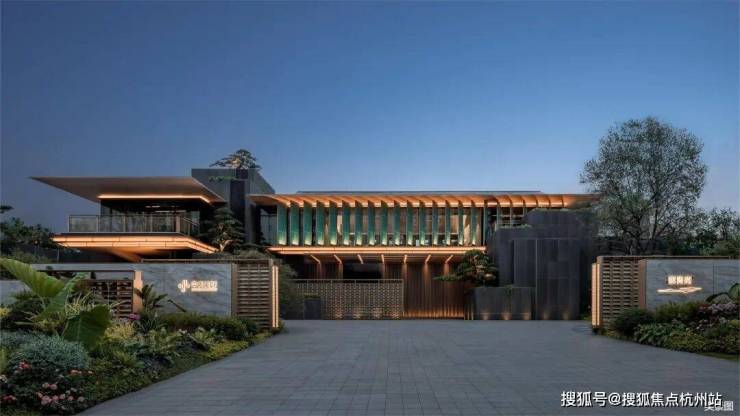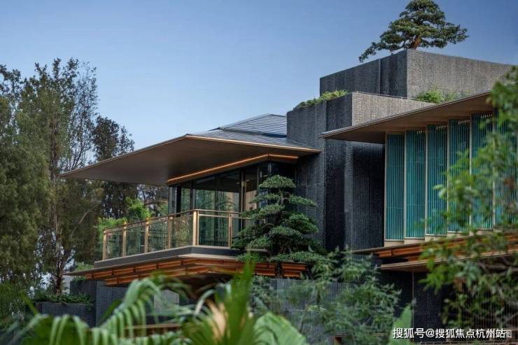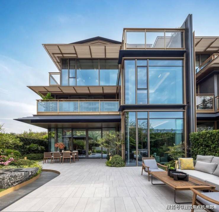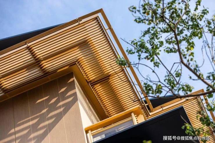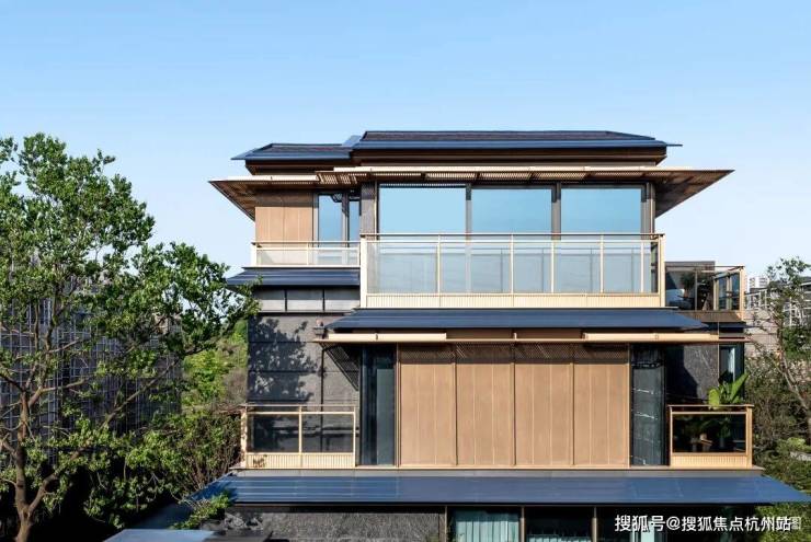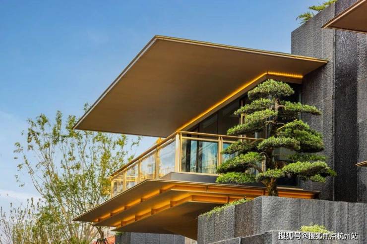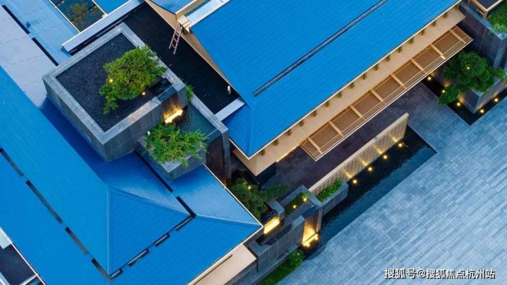 在立面打造上,提取宋代歇山顶样式,转译形成深远的挑檐,整体呈现一种清雅内敛的当代气质;大尺度巨幕玻璃窗镶嵌金色铝线条,极简化打造光影天幕,倒映自然之境;臻选靛蓝色的陶瓦,原创蓝金坡屋顶,掀起杭州合院立面的新序章。