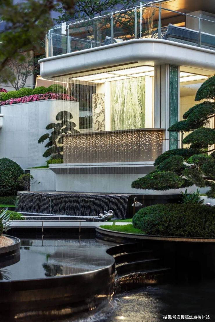 如果近距离看,项目的入口细节之处又不是奢华,尤其是大面积的奢石运用(梵高白奢石+古驰黑石材),绝对是大手笔,再搭配四根梵高白立柱托起古铜色铝板,层层抬升,豪宅大院的气质扑面而来。