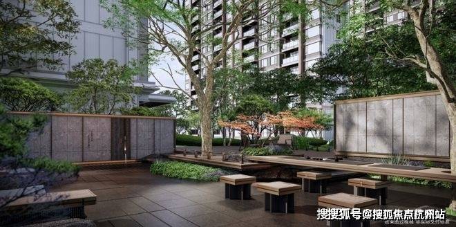雅致石院与中庭古树相映,植物组团错落有致,营造出清逸山水园林之美,唤醒人们对林荫树下休憩闲聚的场地记忆。
