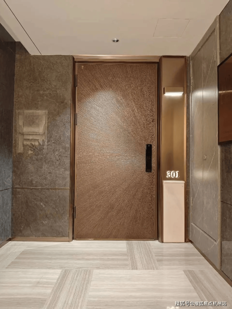 两梯两户定义归家排场,候梯厅以黑金配色为主调,奢华装修格调拉满,金属线条与黑色石材巧妙搭配,辅以精致灯饰,彰显高端质感与尊贵身份,归家仪式感十足。
