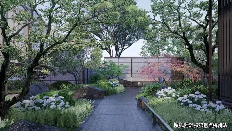 一条清韵石径,挑选造型独特的石头、三两组合成景,搭配特选的造型植物,极具艺术美感。而清泉石流景墙背后,就是未来业主的生活区。