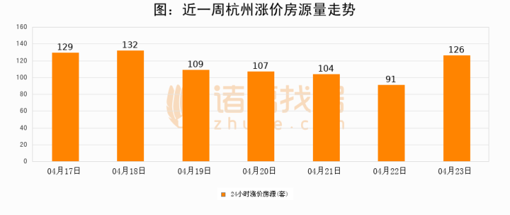 根据诸葛找房数据显示,杭州24小时涨价房源量为126套,较04月22日增加35套,环比上涨38.5%。与此同时,涨价房源占比小幅扩大,业主信心有所提升。