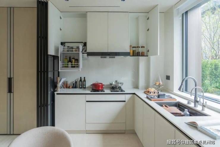 收纳系统是骊住的魔法五金:高柜里有旋转拉篮,再深的东西一转就出来;吊柜有升降拉篮,轻轻一拉,东西就送到手边,彻底不用踮脚爬高。