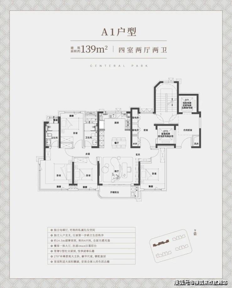 建面约125㎡四房两厅两卫:四开间朝南,南向总面宽13.5米,餐客厅一体化连接6.8米贯通式阳台,折后总价780-850万。