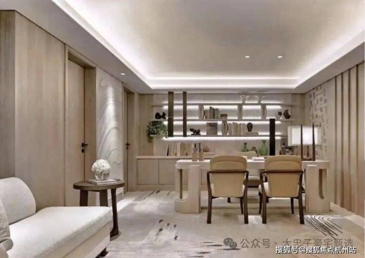 主厅核心区悬浮式定制柜体,银箔与丝绸在几何切割中构建中式基因,毕加索石材的天然裂变肌理成为天然艺术装置。瀑布吊灯以流体力学演绎东方留白,让光影在岩板表面生长出动态水墨意境。