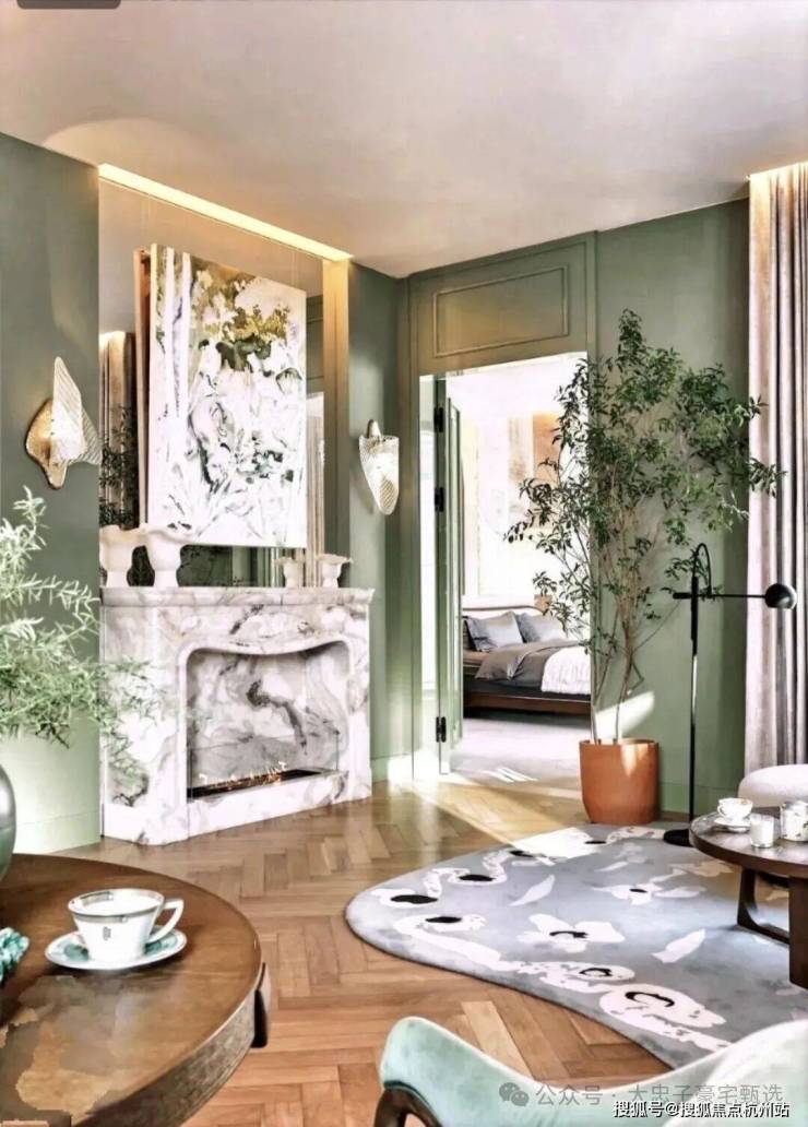 顶层下午茶区以淡绿为底,壁炉暖光漫过手绘地毯的肌理,将社交场域沉淀为冥想容器;主人房墙面缟玛瑙(Onyx)的天然流痕,也与一层屏风暗纹形成时空对位,光影在矿物晶体中生长出私密的诗。