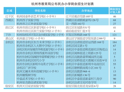 杭州公民同招排名前列阶段录取有了较新进展。昨天,杭州市教育局公布了尚有剩余名额的民办小学名单。报名民办小学未录取的儿童,可于今天11点前,在未完成招生计划的民办小学中补报一所学校,继续参加该民办小学的招生。