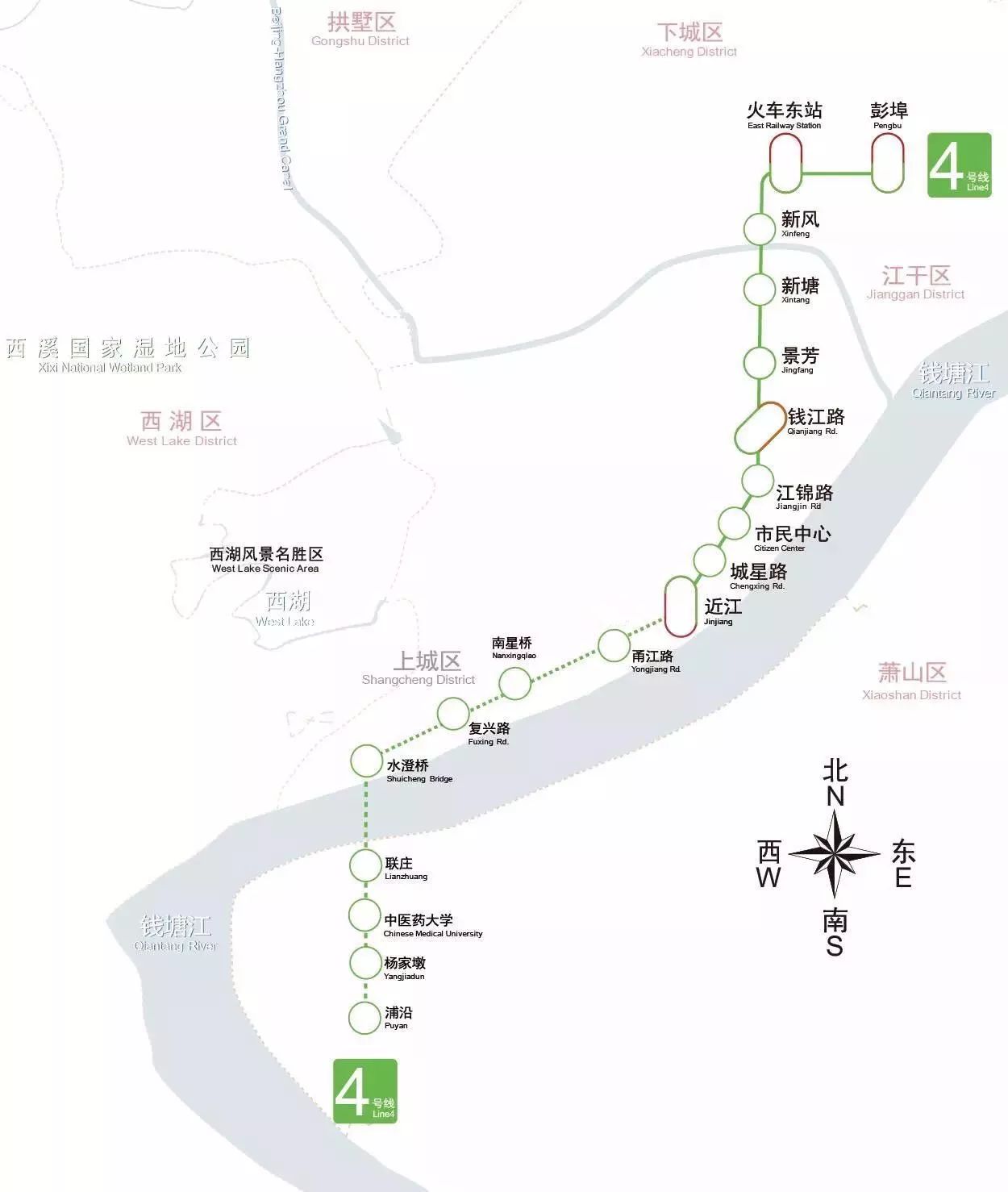 即将开通的一期南段起于滨江的浦沿站,线路依次沿浦沿路→东信大道→钱塘江→复兴路→钱江路→富春路敷设,止于首通段终点近江站。线路全长约11.2km,共设浦沿站、杨家墩站、中医药大学站、联庄站(暂缓开通)、水澄桥站、复兴路站、南星桥站、甬江路站等8座车站,其中换乘站2座,分别为中医药大学站(与6号线换乘)、南星桥站(与5号线换乘)。