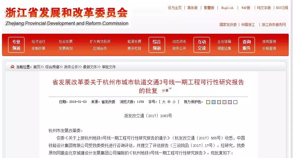 浙江省发改委官网昨天公布了《省发展改革委关于杭州市城市轨道交通3号线一期工程可行性研究报告的批复》。