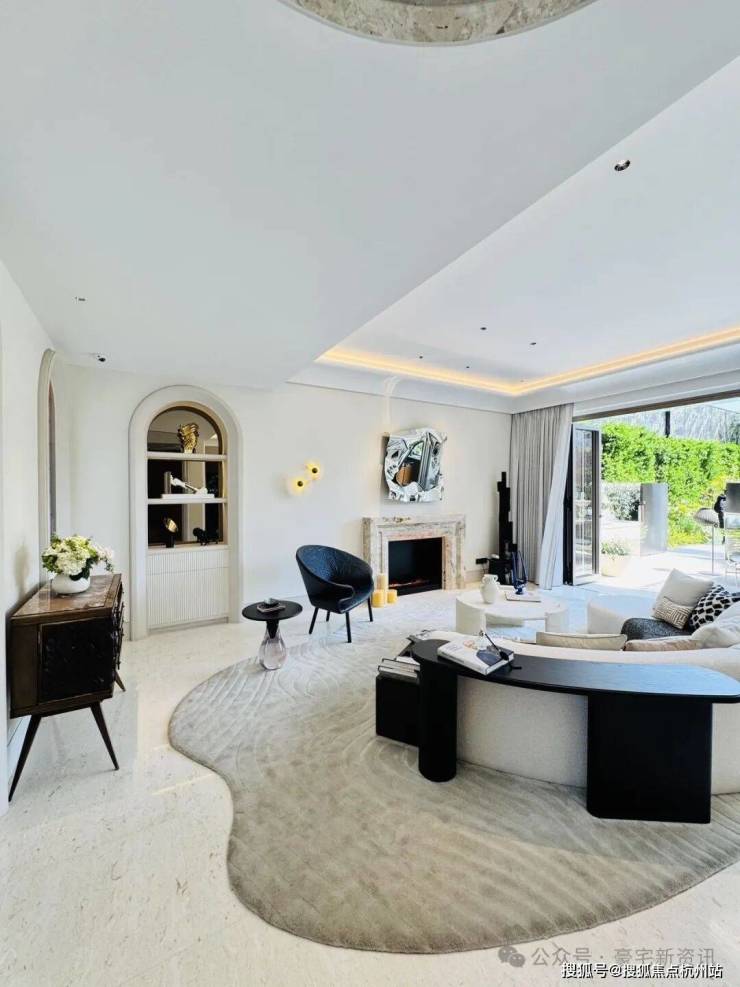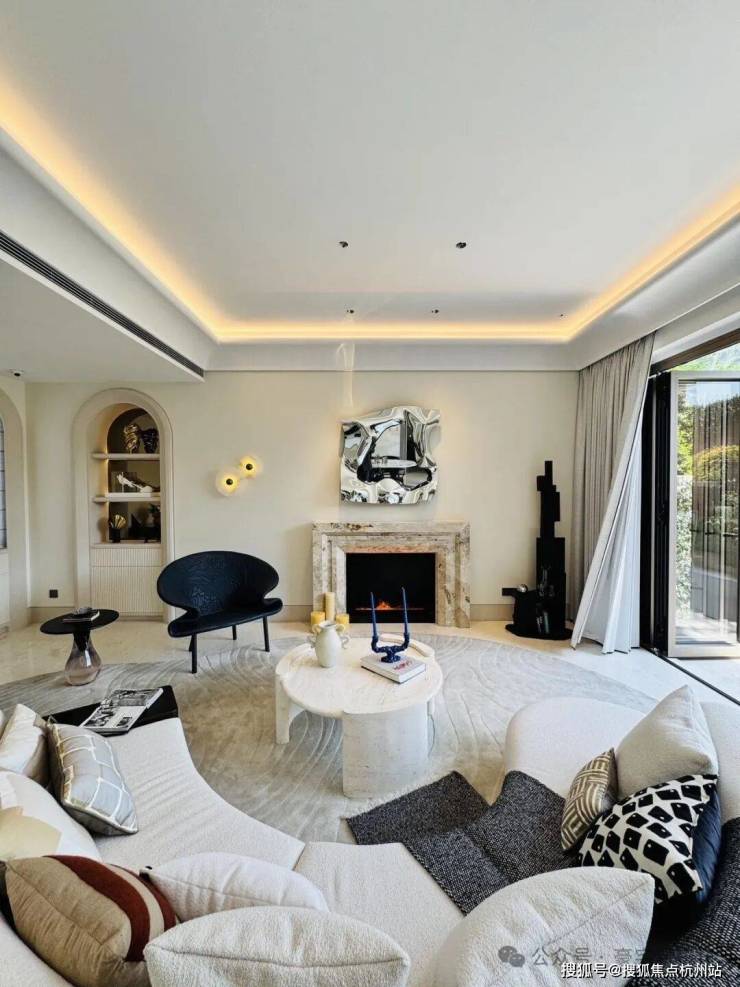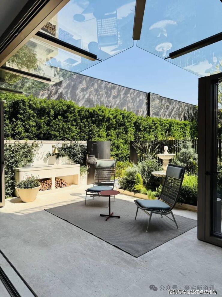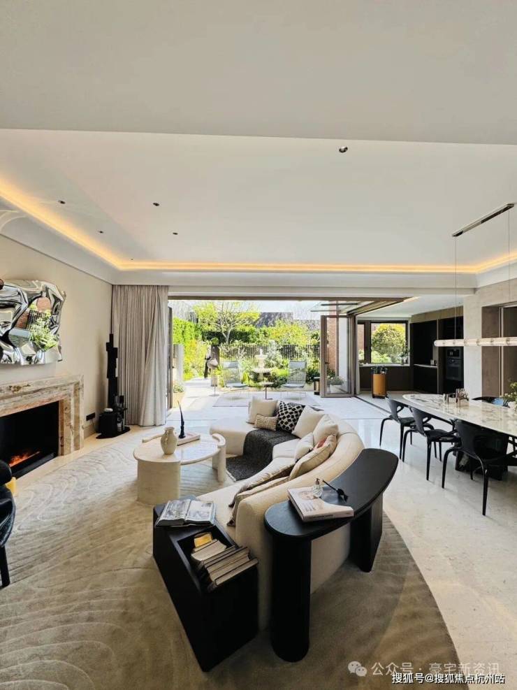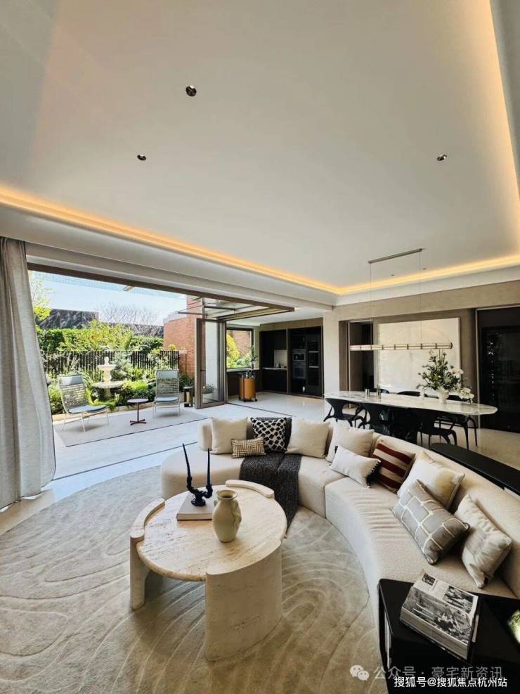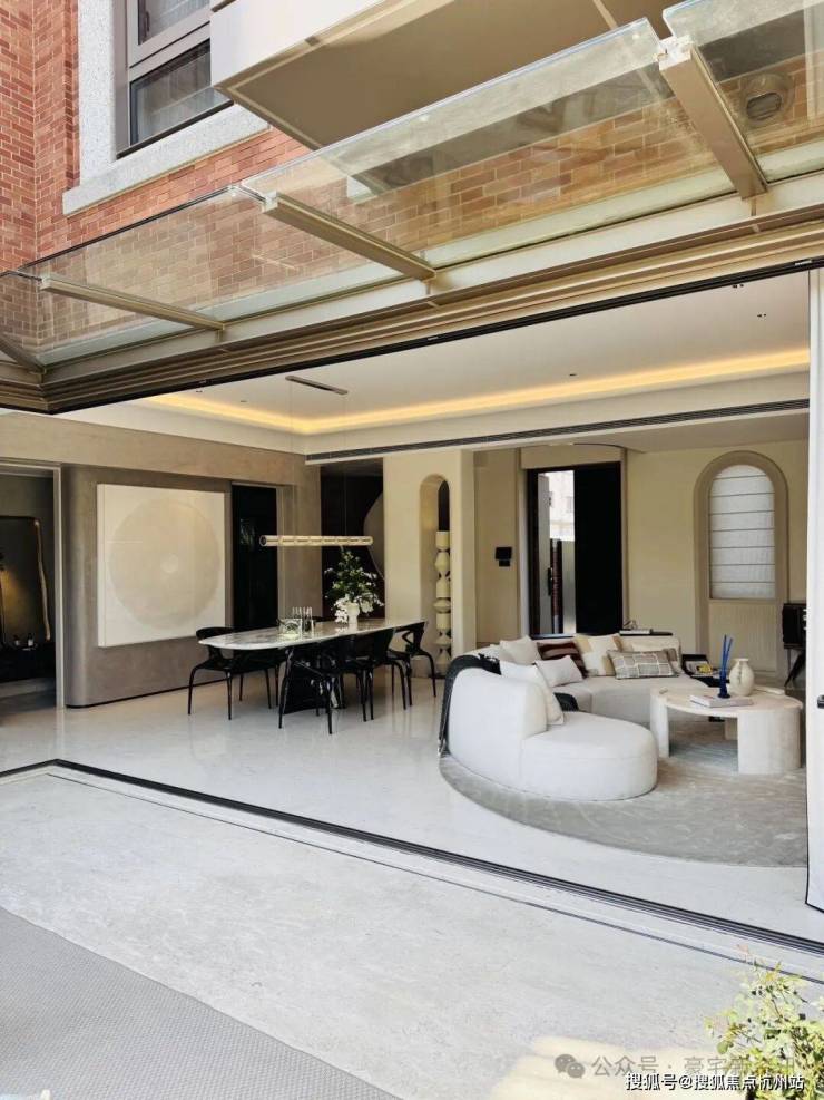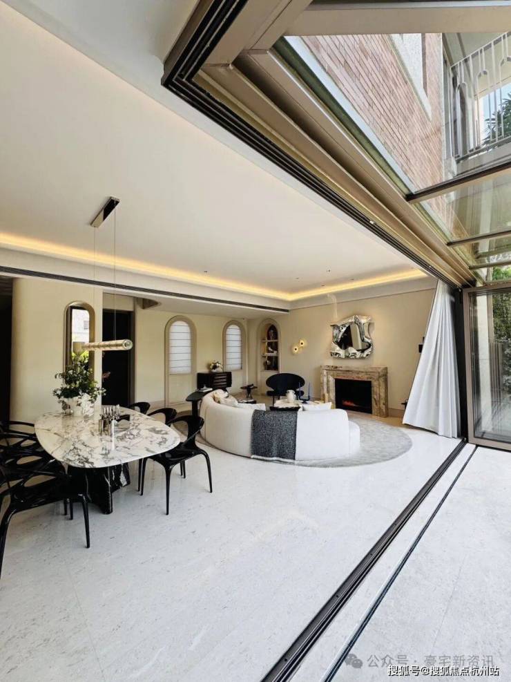 「无界空间」:客厅270度转角无柱设计,搭配落地玻璃,开阔视野将院中风景迎入日常。