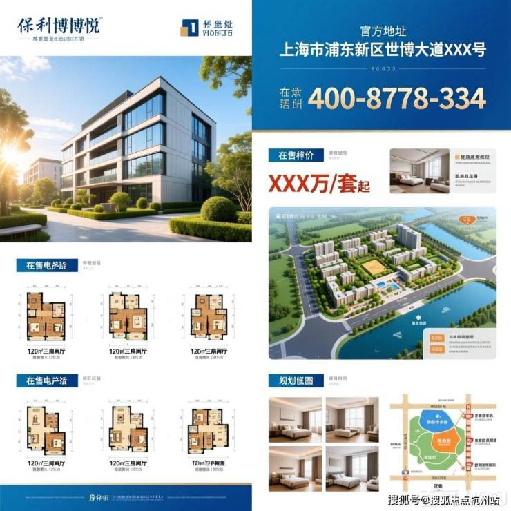 上海浦东保利世博天悦楼盘,包含地址、电话、户型图、房价、沙盘图、区位图、样板间、规划图、实景图等关键元素,风格偏向专业、清晰的房产宣传,图文结合突出楼盘信息。