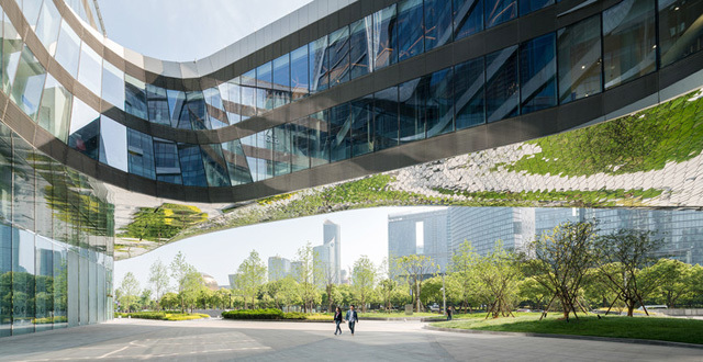 阶梯式广场将建筑物与绿意盎然的环境融合在了一起。在这里,不同景色的庭院从四个方向通向内庭,形成了裙楼的主要通道和外庭。南北入口引导着游客前往内庭。东西侧可通过螺旋式楼梯进入露天下沉式广场,这也是地铁站的入口。此外,杭州来福士中心为多孔结构,室内空气可与公共区域以及自然界进行自由交换。
