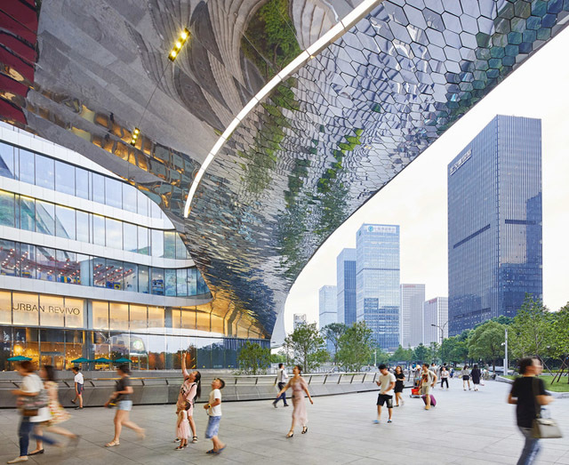 杭州来福士中心在满足个体需求的同时寻求协同效应。例如,双子塔在中庭中有独立的入口,裙楼的屋顶温泉与双子塔中的相关设施是相通的,交错设计的商场和酒店可提供全天候的娱乐休闲活动。