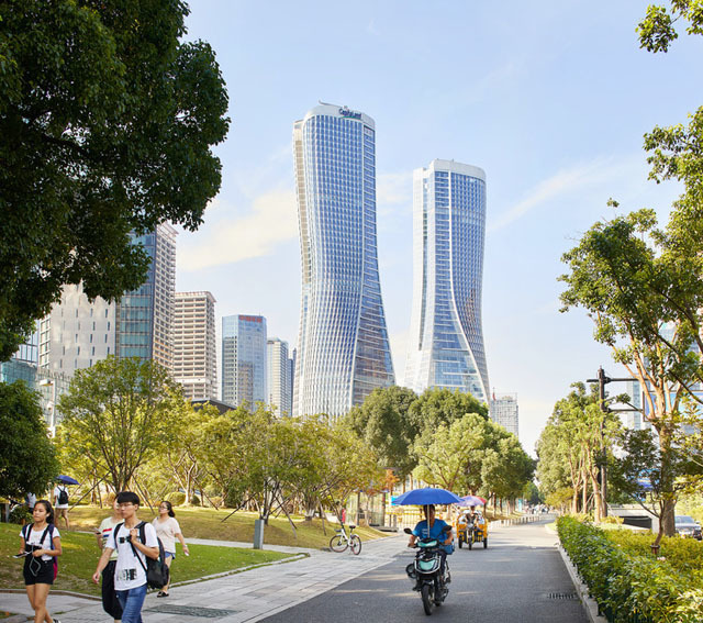杭州来福士中心以杭州著名的自然景观为基础,大厦水波潺潺的外形,仿若钱塘江中川流不息的江水。这些平静的同心圆水波从底部开始,沿着纵轴线一层层盘旋而上,愈来愈富有动感。采用这些表现手法,有效地将整个建筑物中的各部分流畅地结合在了一起,也增强了这座绿色城市的景观特色。双子塔位于市中心斜对面一角,周围高楼林立;附近有三座绿轴/城市公园,连接着西湖和钱塘江。双子塔的建筑风格优质地融合了这两种环境,城市面对着美景,同时美景也回应着城市。这两座塔的设计相似而却不同,他们互为补充,彼此呼应。
