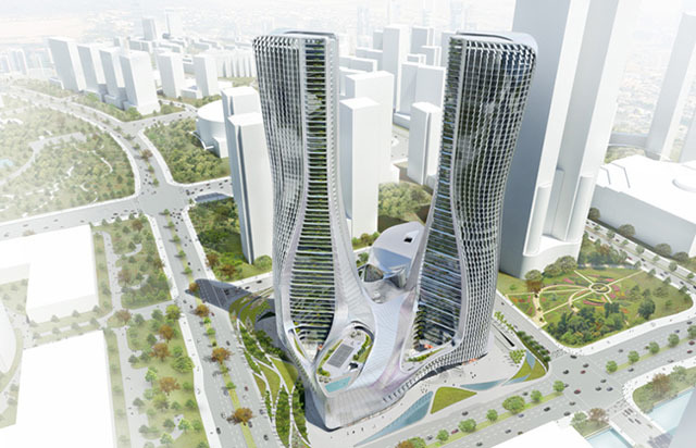 双子塔的设计为两个对角线和相交的八字形。双子塔相对而立,其设计为两个对角线和相交的八字形,每座塔都由一个“建筑立面”(主要是由于中心坐落于城市一角)和一个水平的“景观立面”(落入裙楼的内庭中)所构成。中心大门朝南,是通往城市公园和市中心的重要通道。双子塔呈东西走向,以较大程度地减少遮蔽物,确保住宅和办公室日照充足。