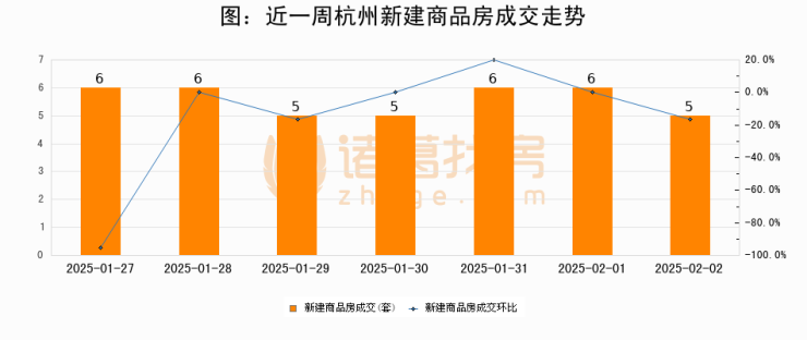 根据杭州市住房保障和房产管理局数据显示,2025年02月02日杭州新建商品房成交5套,较昨日减少1套,环比下降16.7%